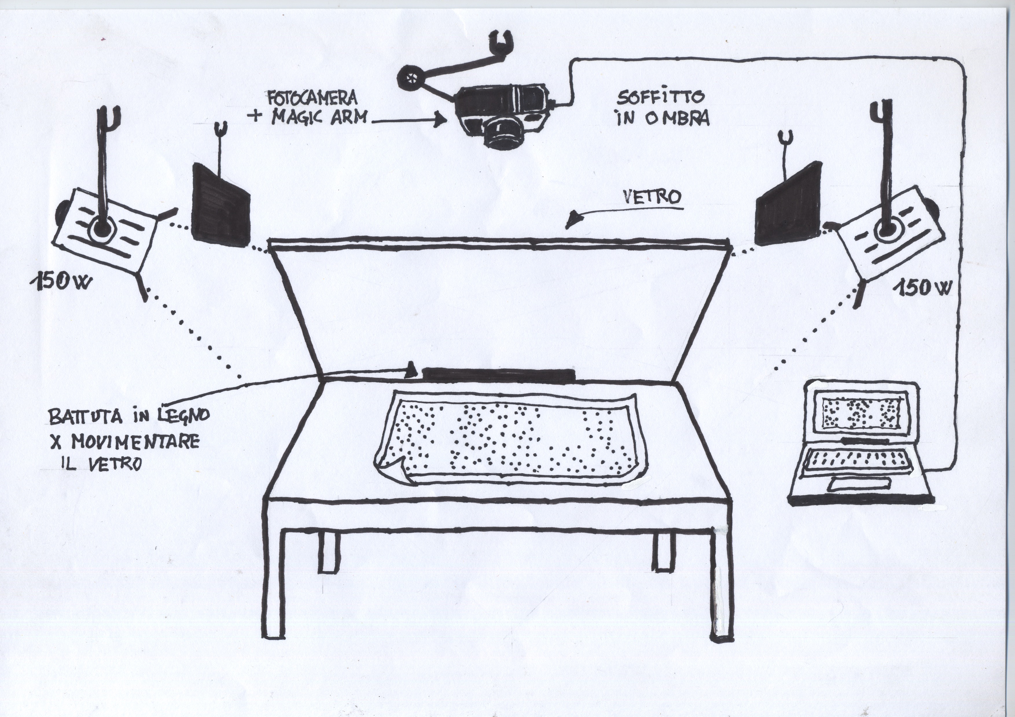 Se il tavolo vi arriva circa a metà delle cosce, la fotocamera sta almeno ad un metro e mezzo più in alto, sopra la vostra testa. Macchinoso da controllare manualmente. Occorre perciò controllare da remoto la fotocamera con un computer che abbia software adeguato e una porta USB. Le reflex digitali degli ultimi dieci anni hanno questa possibilità. In ambiente Linux si usa Capture. Consigliato l’uso di uno zoom ottico anche mediocre.